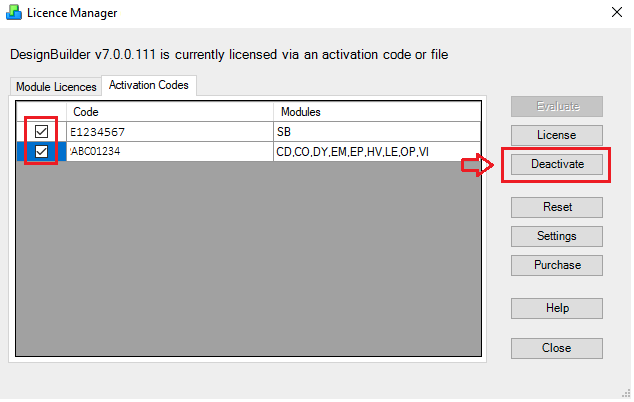 1. If the license is still active, open the DesignBuilder License Manager > Activation Codes tab, select the code, and press the Deactivate button.