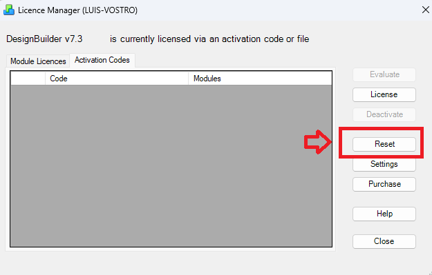 2. Press the RESET button available at DesignBuilder License Manager,