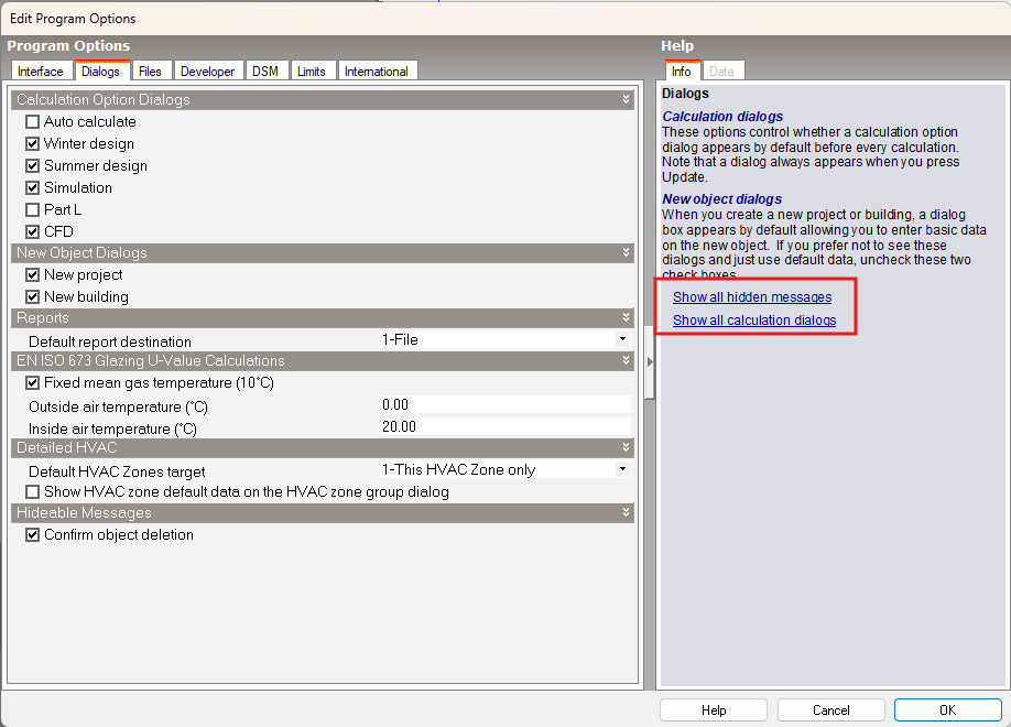 To restore the hidden messages and calculations dialogs please go to the DesignBuilder menu and select: