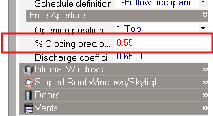 The opening factor input for TM59 analysis is adopted as “%glazing area opens” in DesignBuilder.