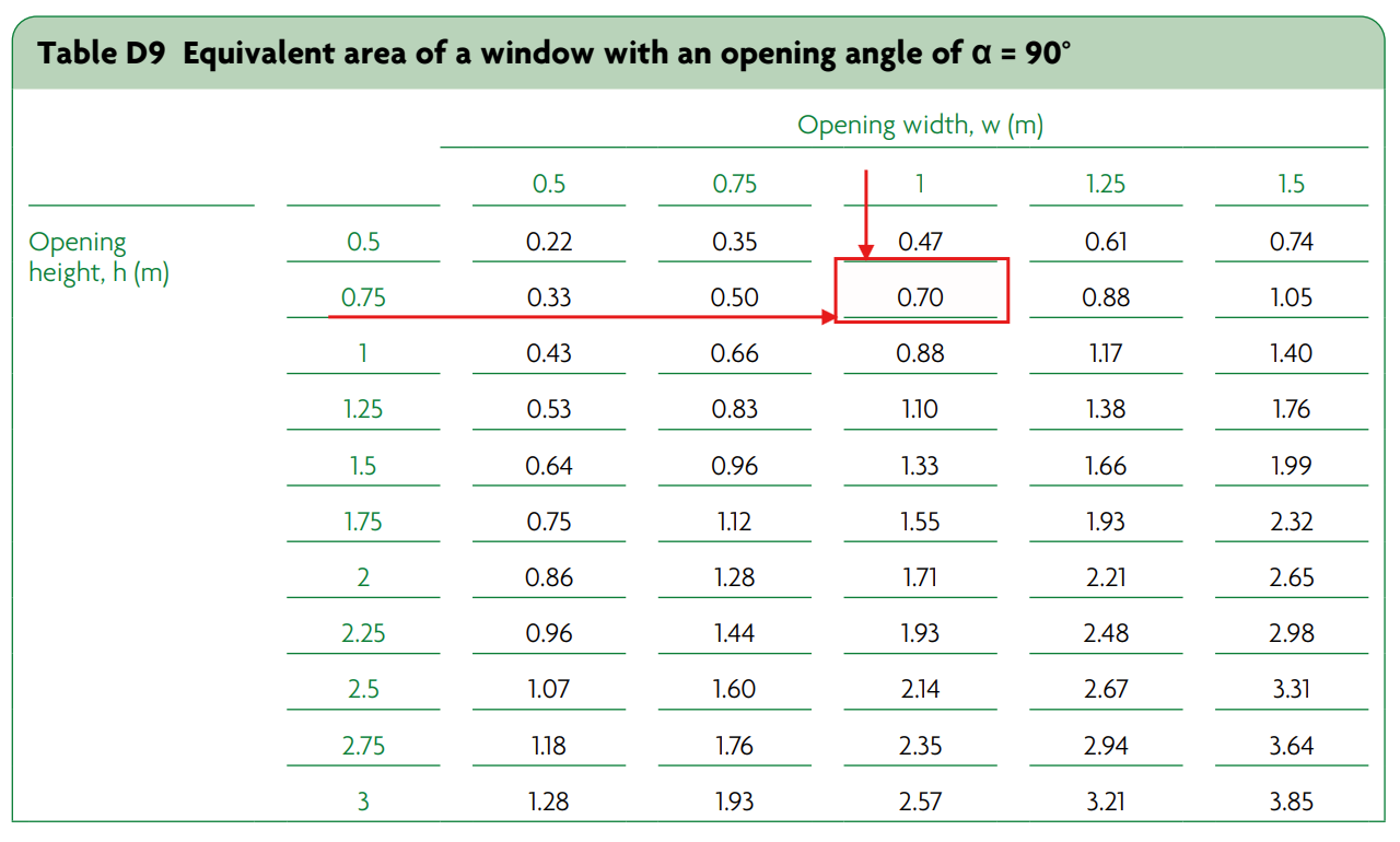 Since the window height is 1.5 m and only half opens, we must check the Opening height = 0.75 and Opening Width = 1.0 m