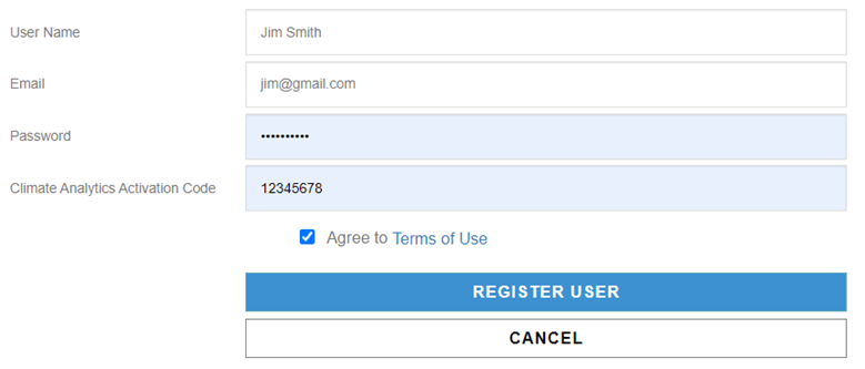If you have not done so already, the first step is to create an account on the Analytics platform by registering your user name, email address, password and the activation code you received when you ordered your Climate Analytics licence.