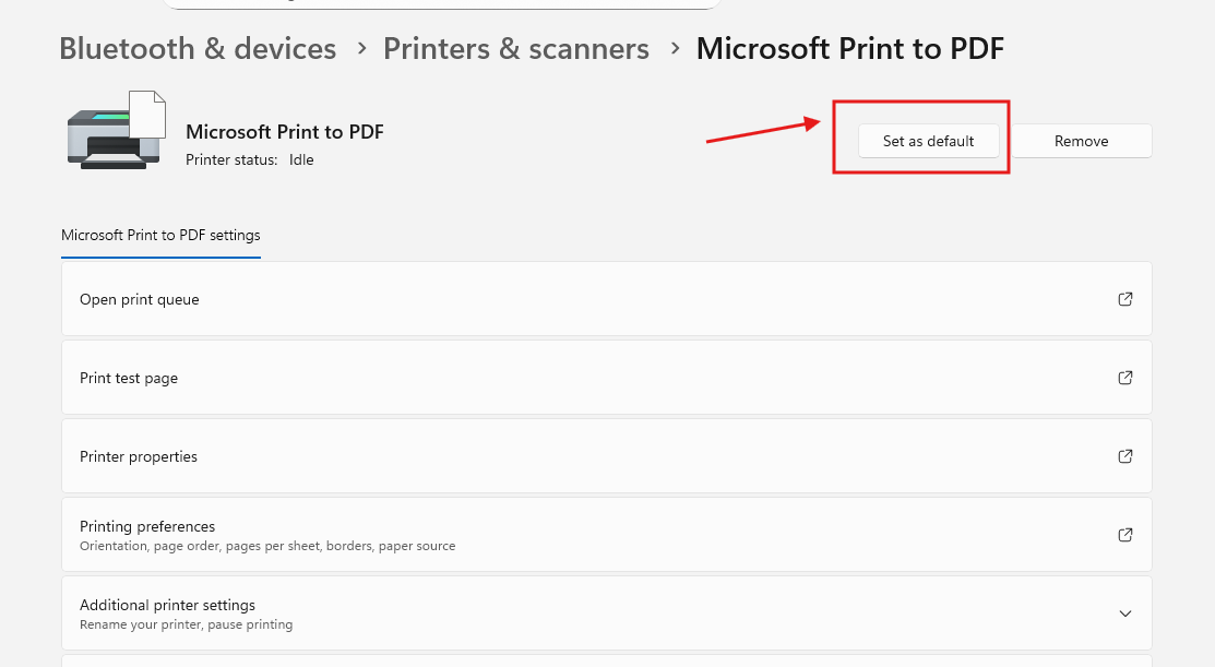 To address this you will need to change your default printer to Microsoft Print to PDF at Printer and Scanners area.